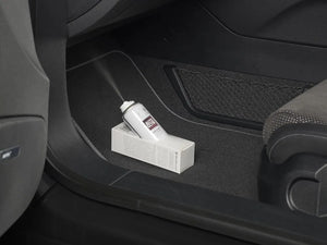 3. Shake the aerosol can well. Fold in the perforated panels of the carton and place the aerosol can at a 40 degree angle. Avoid pointing the aerosol at the carpet. Position the carton far forward in the passenger side footwell and leave the aerosol facing into the footwell. Depress trigger into the lock-down position. Exit vehicle and close doors.