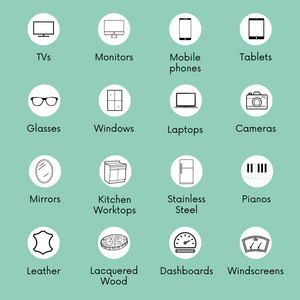 For easy cleaning of glass, metal, leather, vinyl & plastic. Perfect for use in cockpits, dashboards, infotainment systems, phones, laptops & tablet screens and kitchen stone worktops.