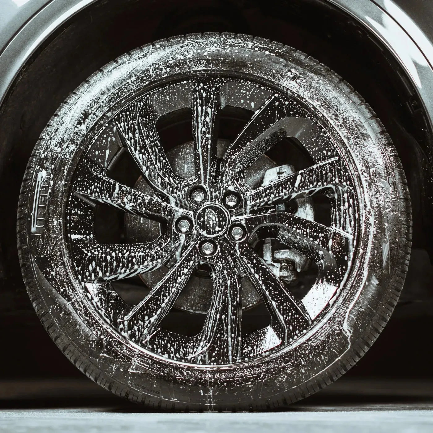 Working on one wheel at a time, apply the cleaner generously from the bottom up, fully coating the wheel surface.